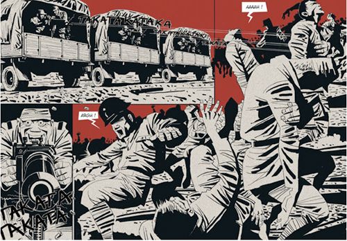 Le graphisme de cet album est, désolée du mauvais jeu de mot, taillé au sabre. Des traits vifs, des couleurs frappantes alternant le bleu et gris pour le présent, et le noir, rouge et kaki pour les jours du massacre. Pas de pathos, rien que des faits. A lire et à faire lire.